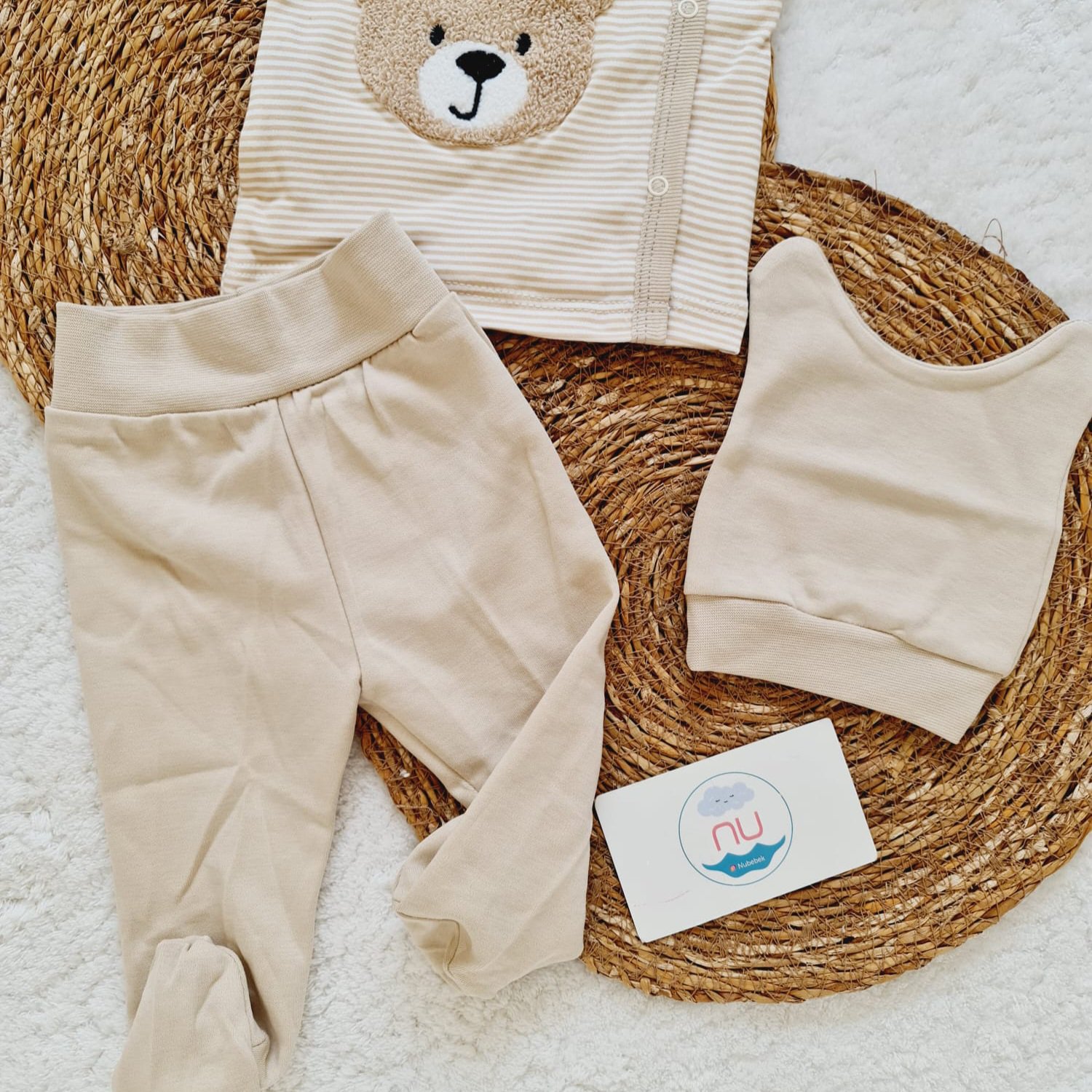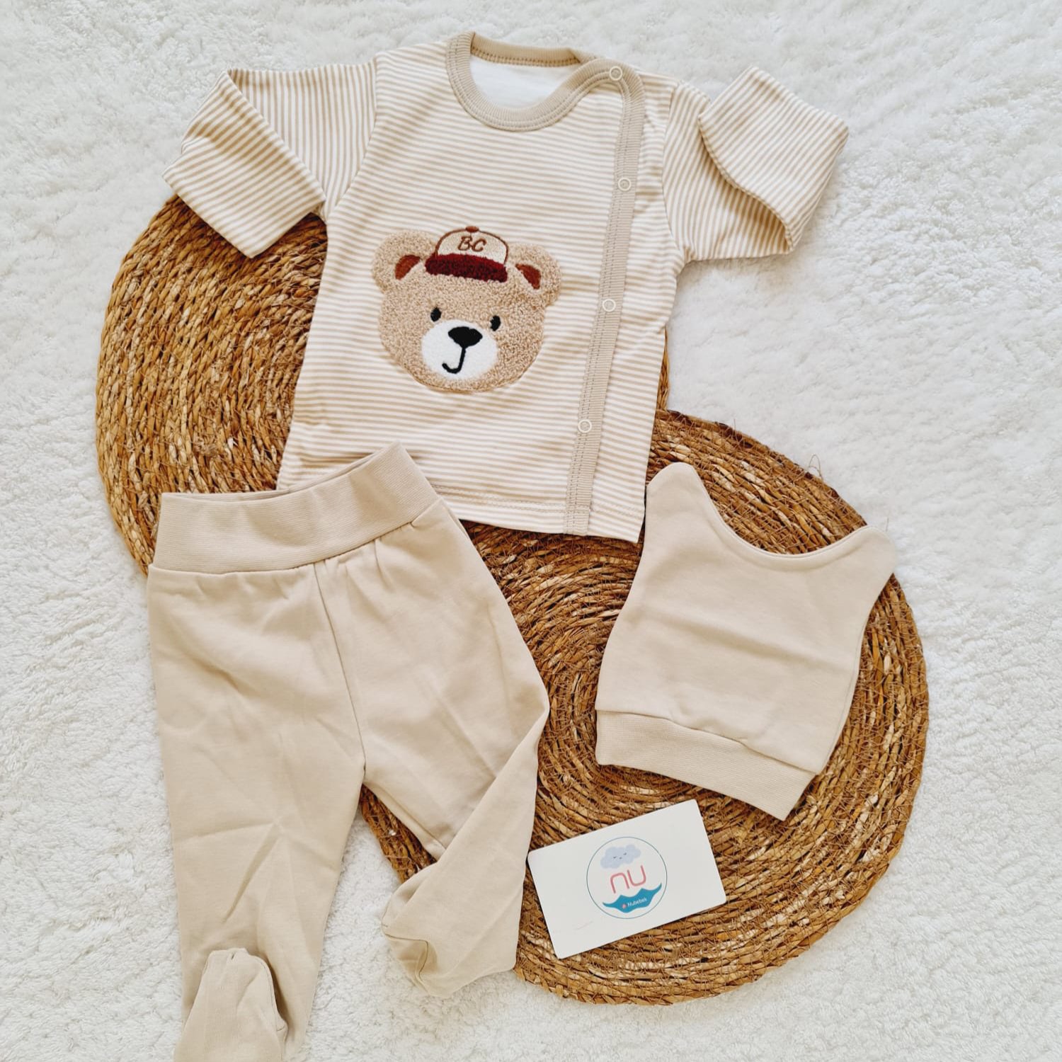 %100 pamuklu kendinden eldivenli 3 parça bebek takimi