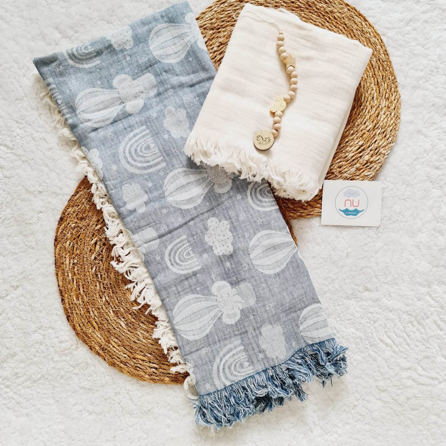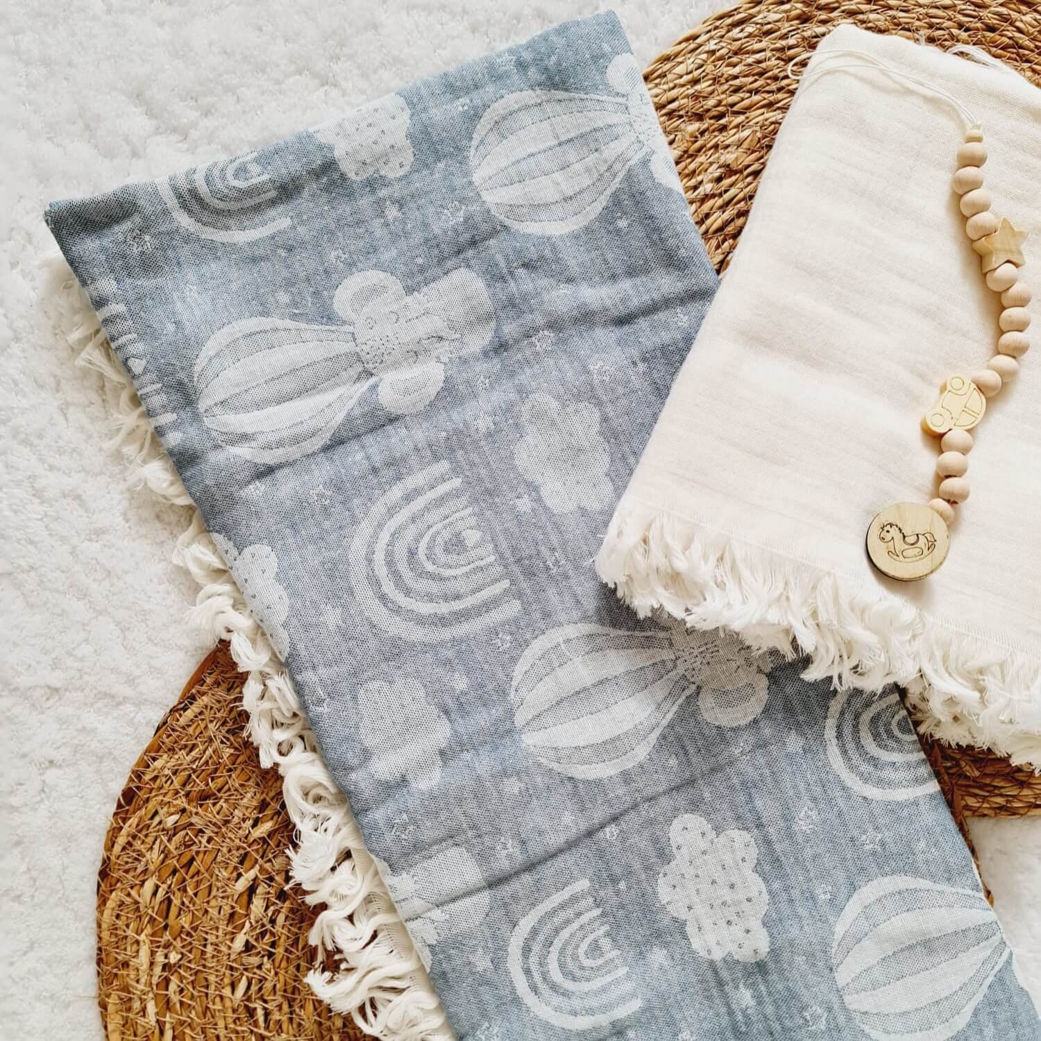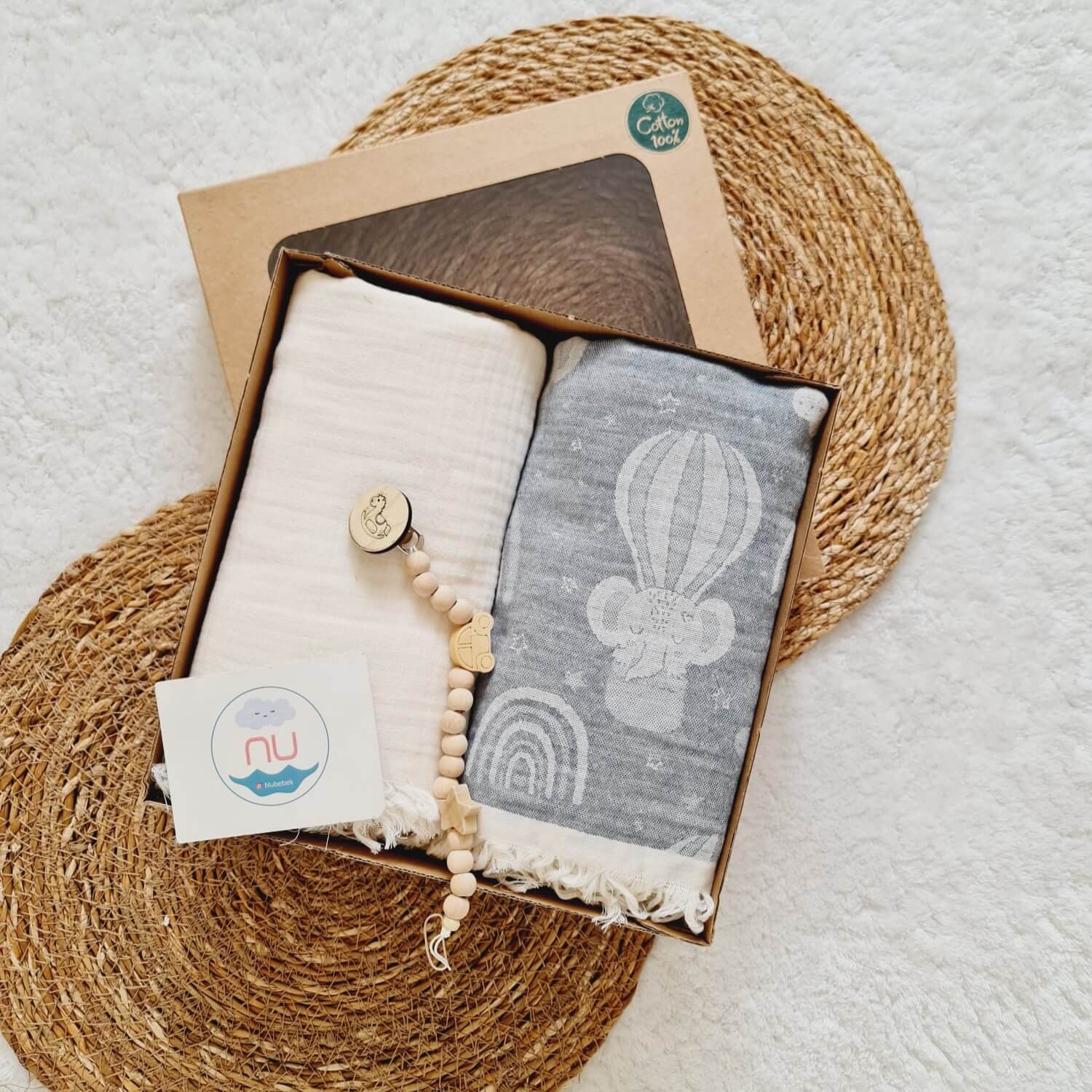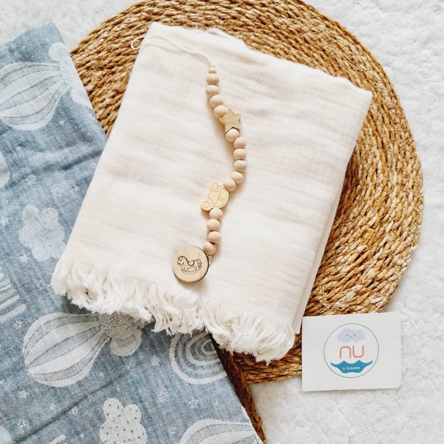 Kapadokya 2’li Bebek Müslin Seti – 2 Adet Müslin Battaniye ve Ahşap Emzik Askısı hediyeli